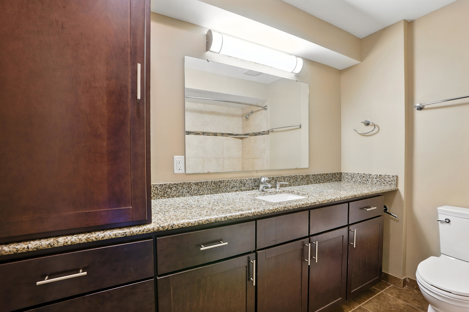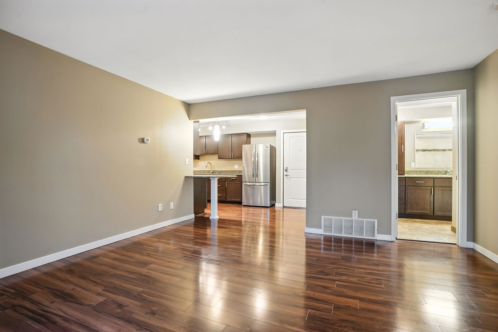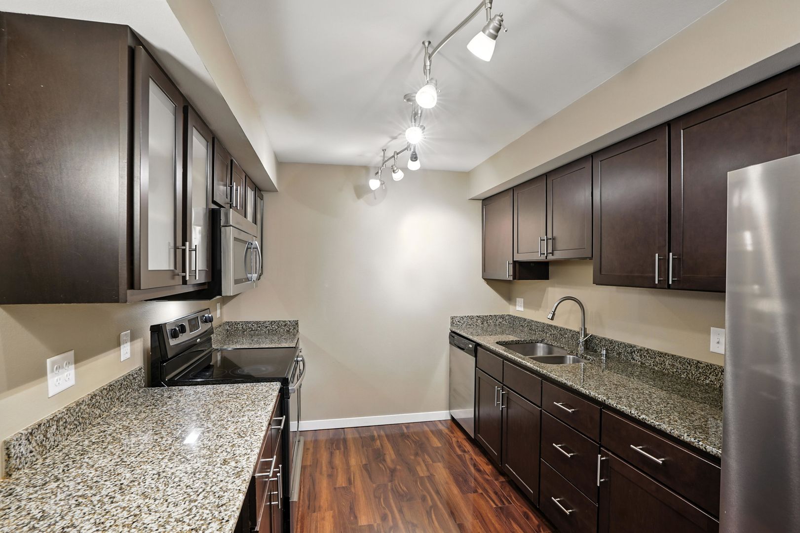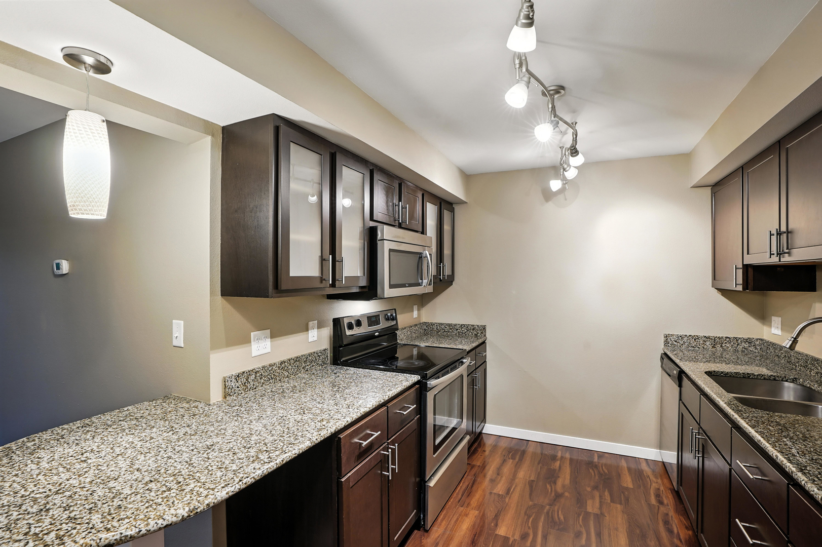 Our 2BR, 1 bath Oakcrest units have a modern feel and upscale finishes. These units feature gorgeous laminate hardwood floors in the main living area, stainless steel appliances, beautiful espresso colored cabinetry, granite counter tops, in unit washer & dryer, balcony, ceramic tile floors in the bathrooms, ceiling fans and window treatments! Each unit includes one parking stall in the common garage with a bike rack in each stall. This building has an elevator and additional outdoor parking available if needed. This is a first-floor unit.