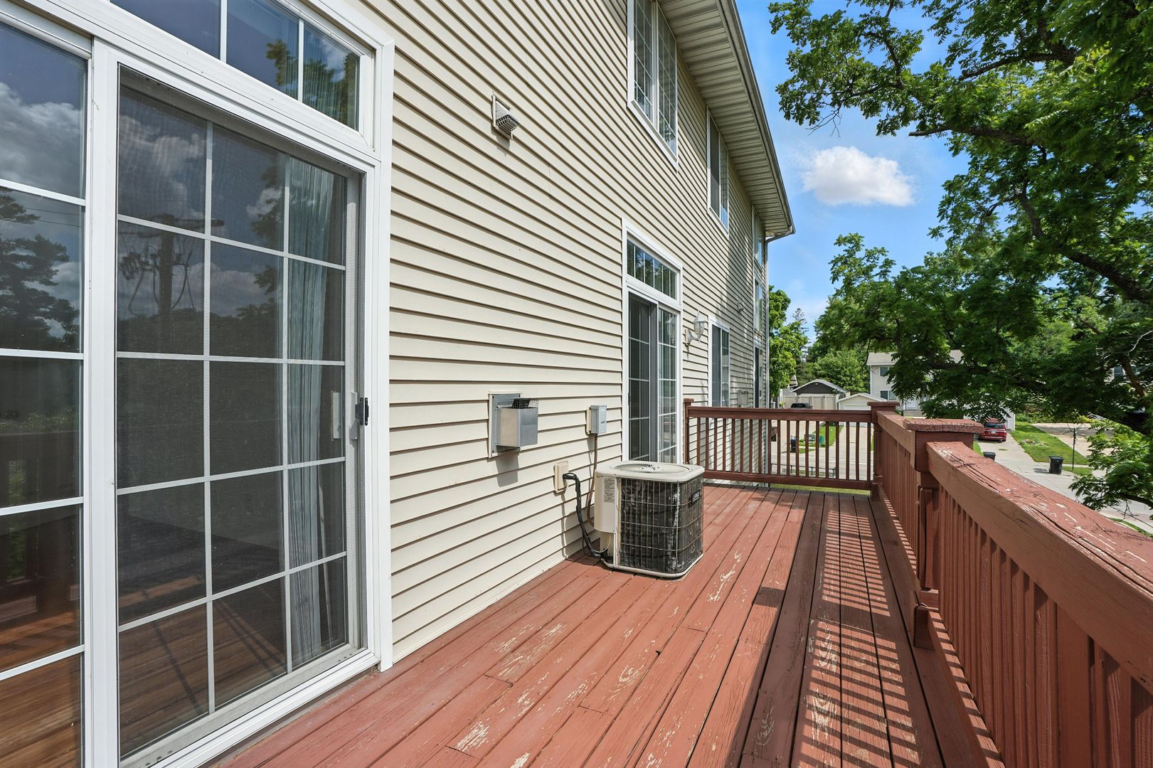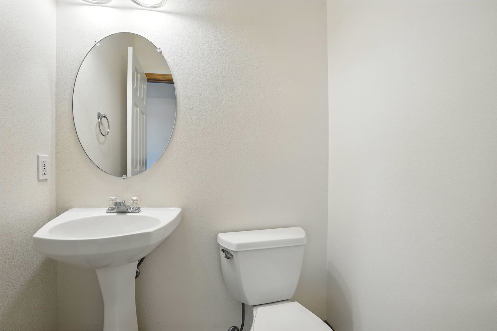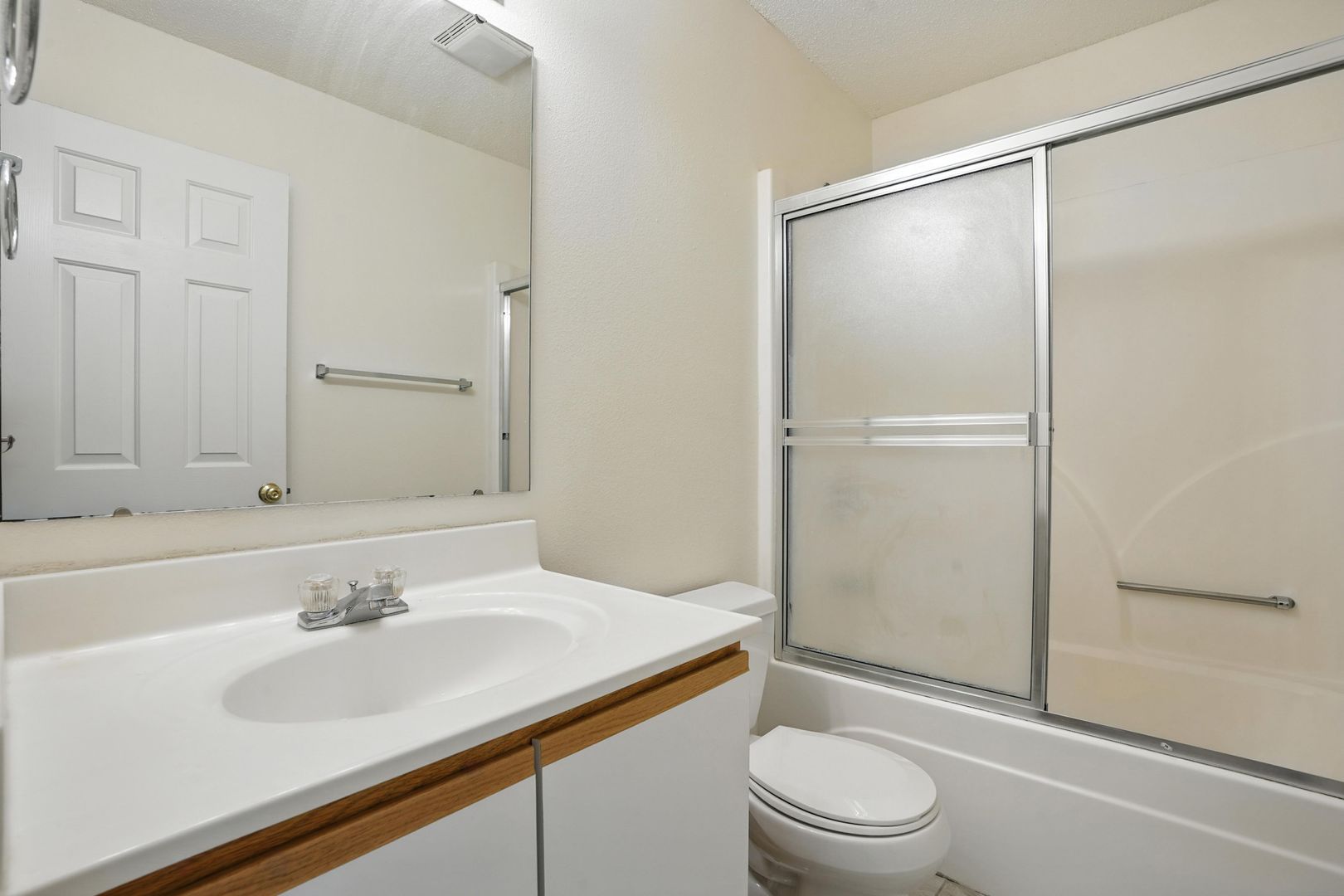 The kitchen includes stainless steel appliances, a large breakfast bar, and plenty of cabinet space. The full bathroom is located upstairs, conveniently near the laundry room with in-unit washer and dryer, and the half bath is on the main floor for guests. You'll also enjoy a private balcony accessible from both the living room and main-level bedroom - ideal for morning coffee or evening wind-downs.