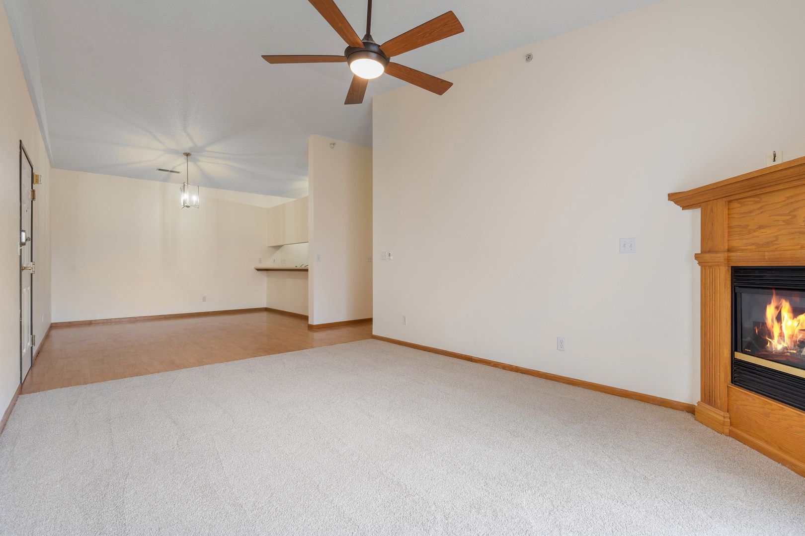 Gas fireplace, stainless steel appliances, and a large breakfast bar