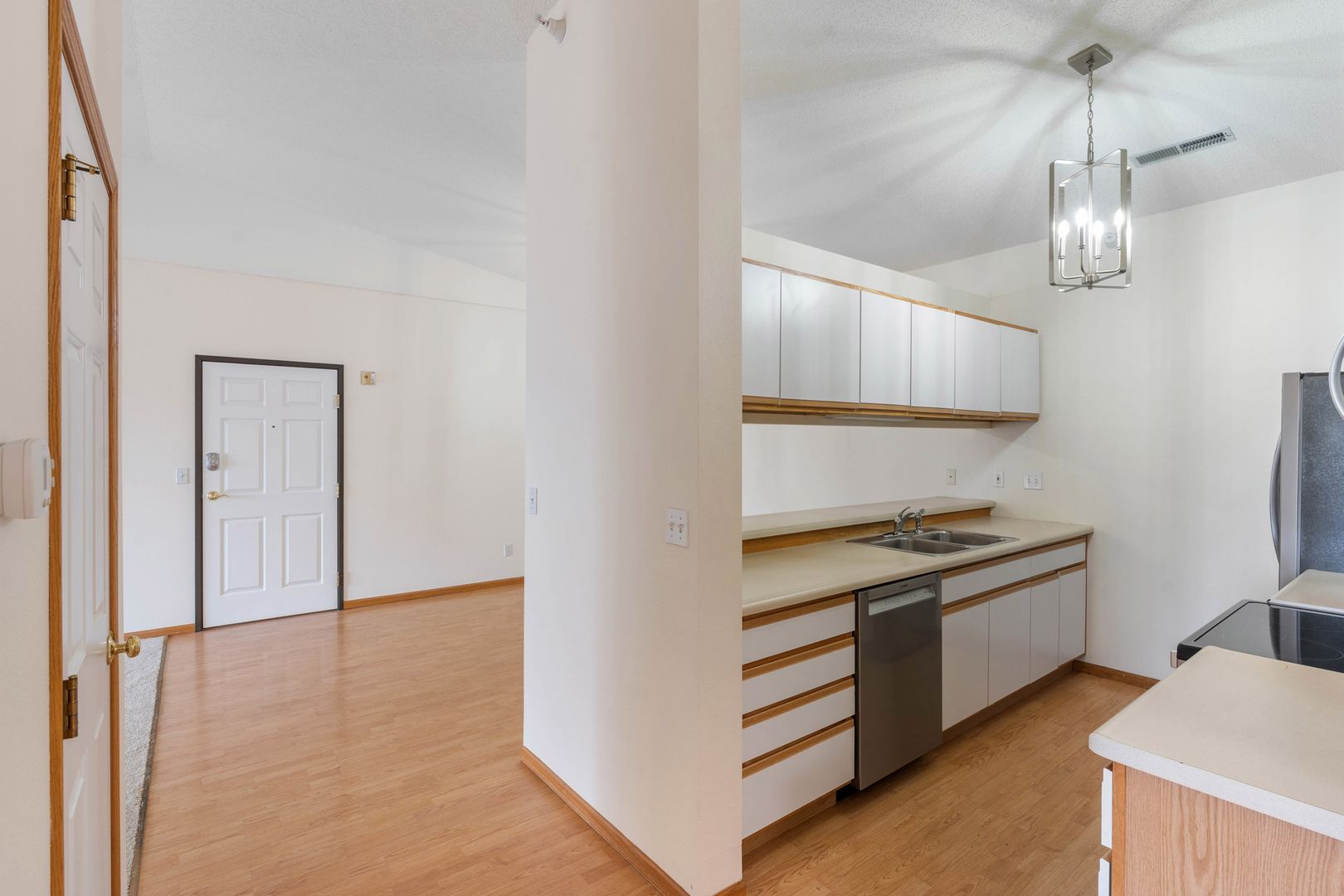 Vaulted ceilings and laminate floors in kitchen, dining room, and hall