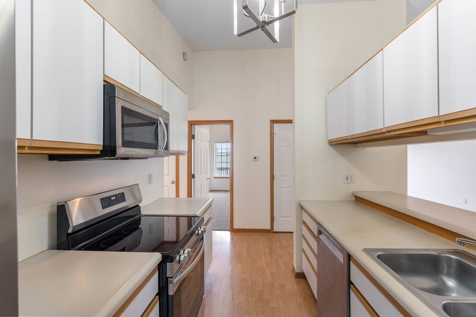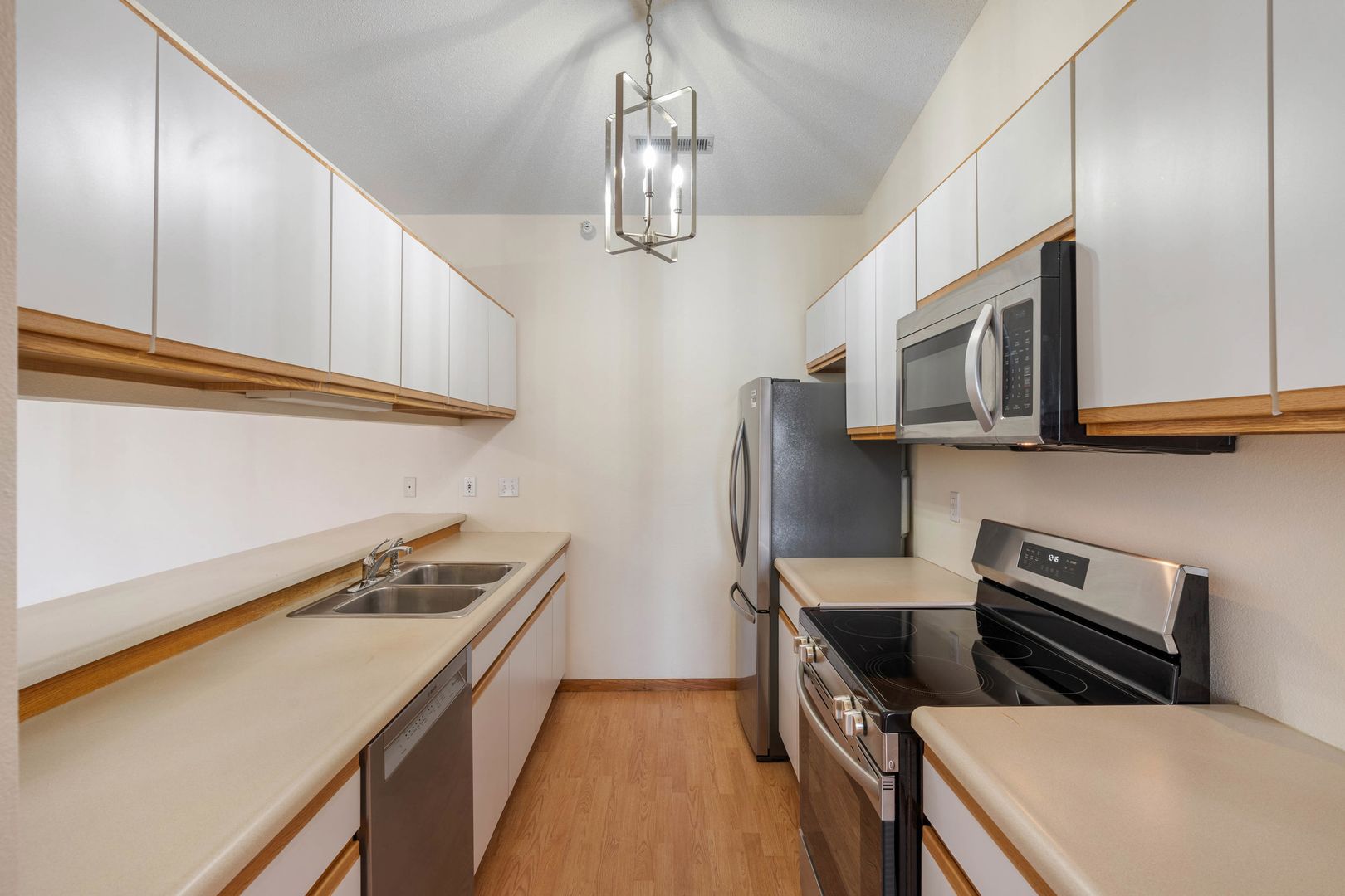 Fresh carpet, stylish tile, contemporary light fixtures, and sleek kitchen appliances