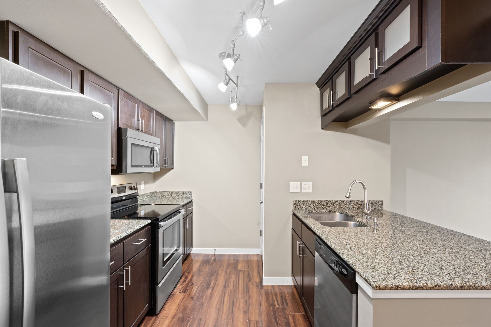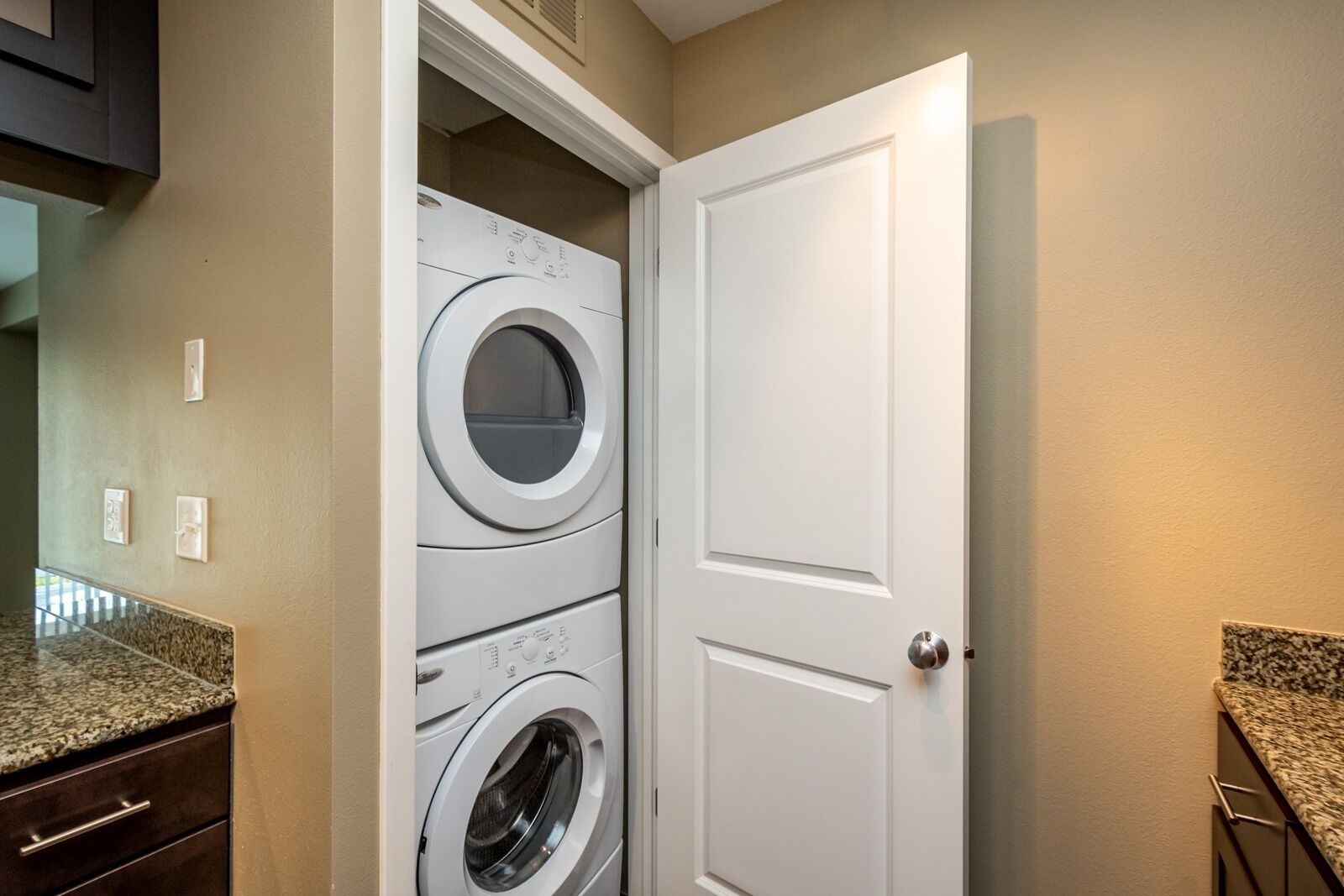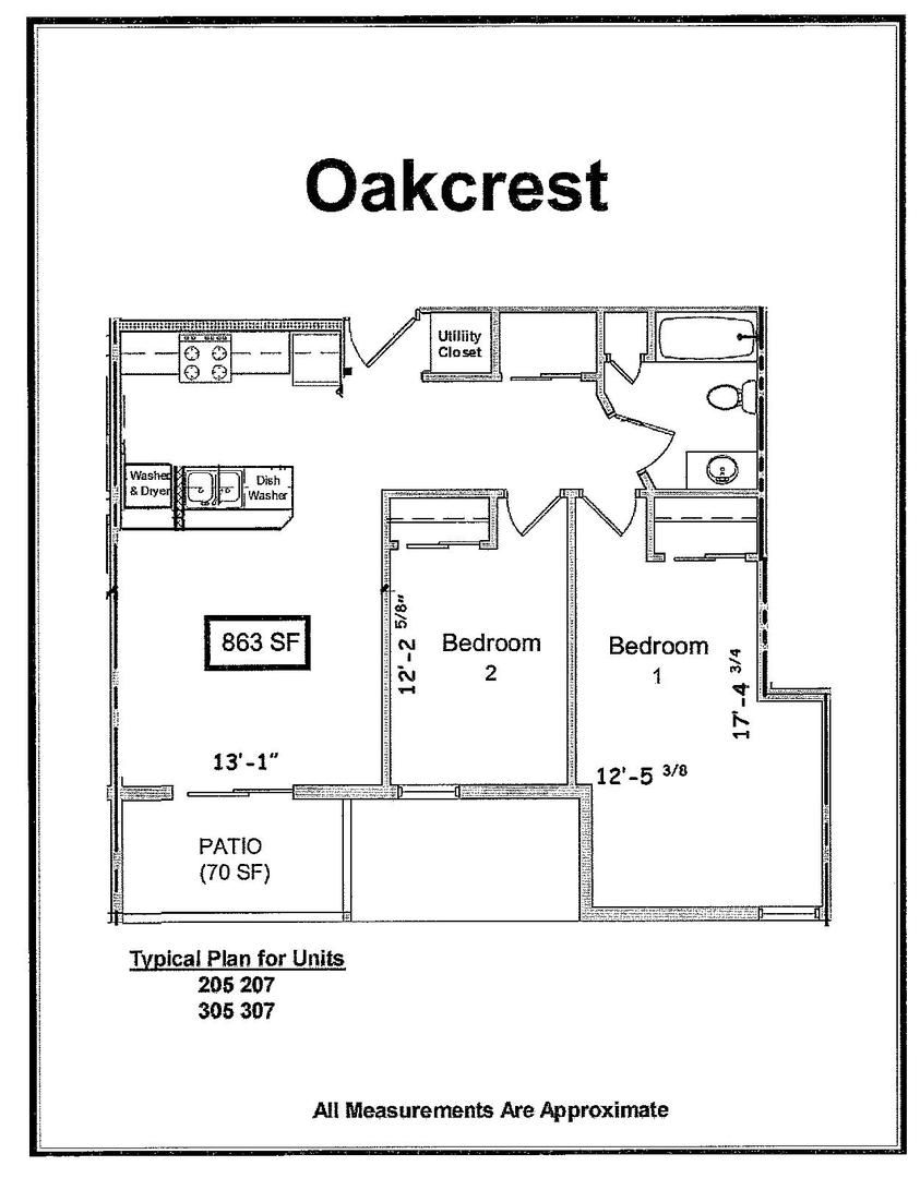This 2-bedroom, 1-bath Oakcrest condo offers a modern look with upscale finishes throughout. This unit features wood-style laminate flooring in the main living area, stainless steel appliances, granite countertops, beautiful cabinetry, and an in-unit washer and dryer. The bathroom includes ceramic tile flooring and a large linen closet. You'll also enjoy a spacious private balcony, ceiling fans, and window treatments.