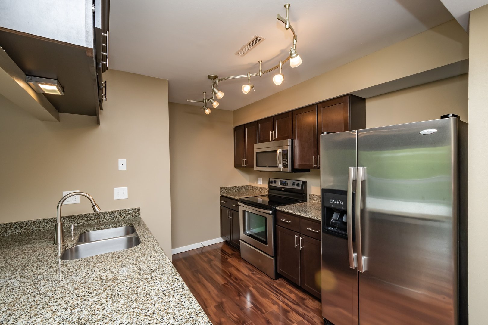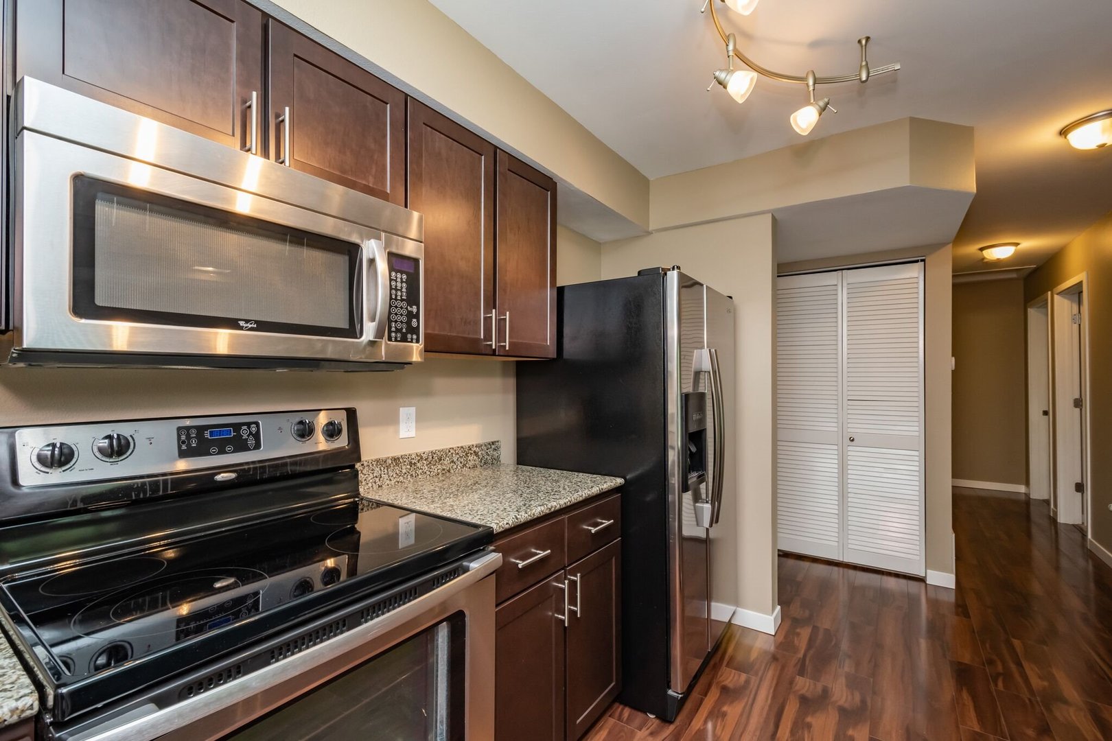 Our 2BR, 1 bath Oakcrest units have a modern feel and upscale finishes. These units feature gorgeous laminate hardwood floors in the main living area, stainless steel appliances, beautiful espresso colored cabinetry, granite counter tops, in unit washer & dryer (new in 2025), balcony, ceramic tile floors in the bathrooms, ceiling fans and window treatments! Each unit includes one parking stall in the common garage with a bike rack in each stall. This building has an elevator and additional outdoor parking available if needed. This is a first-floor unit.