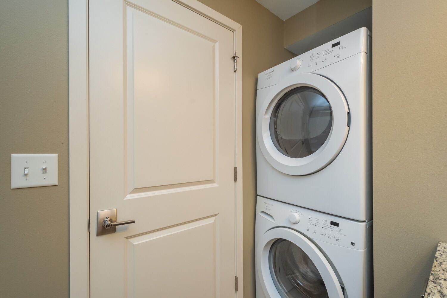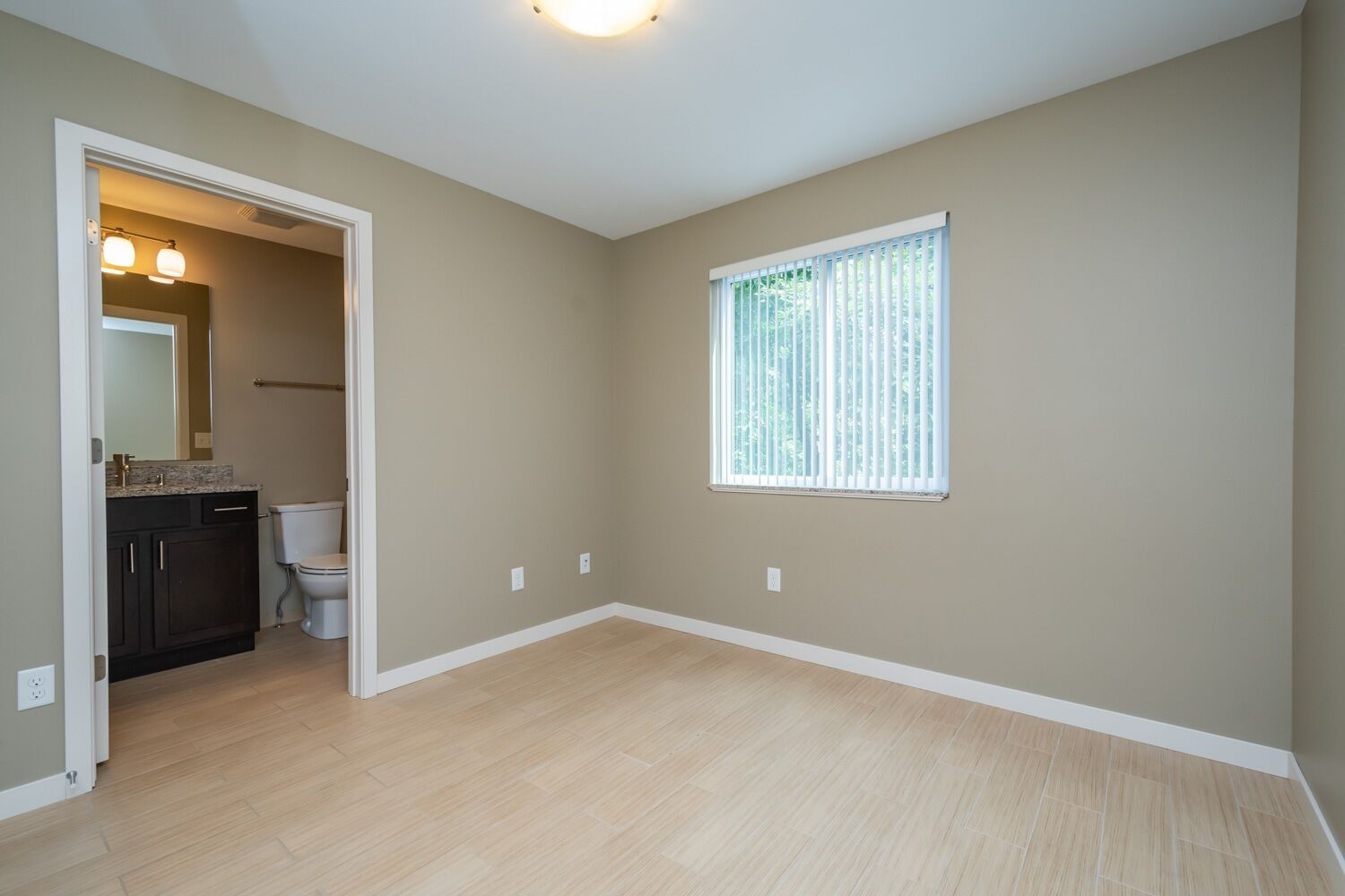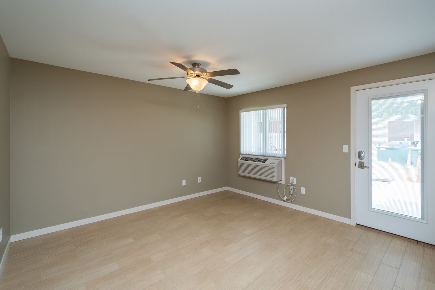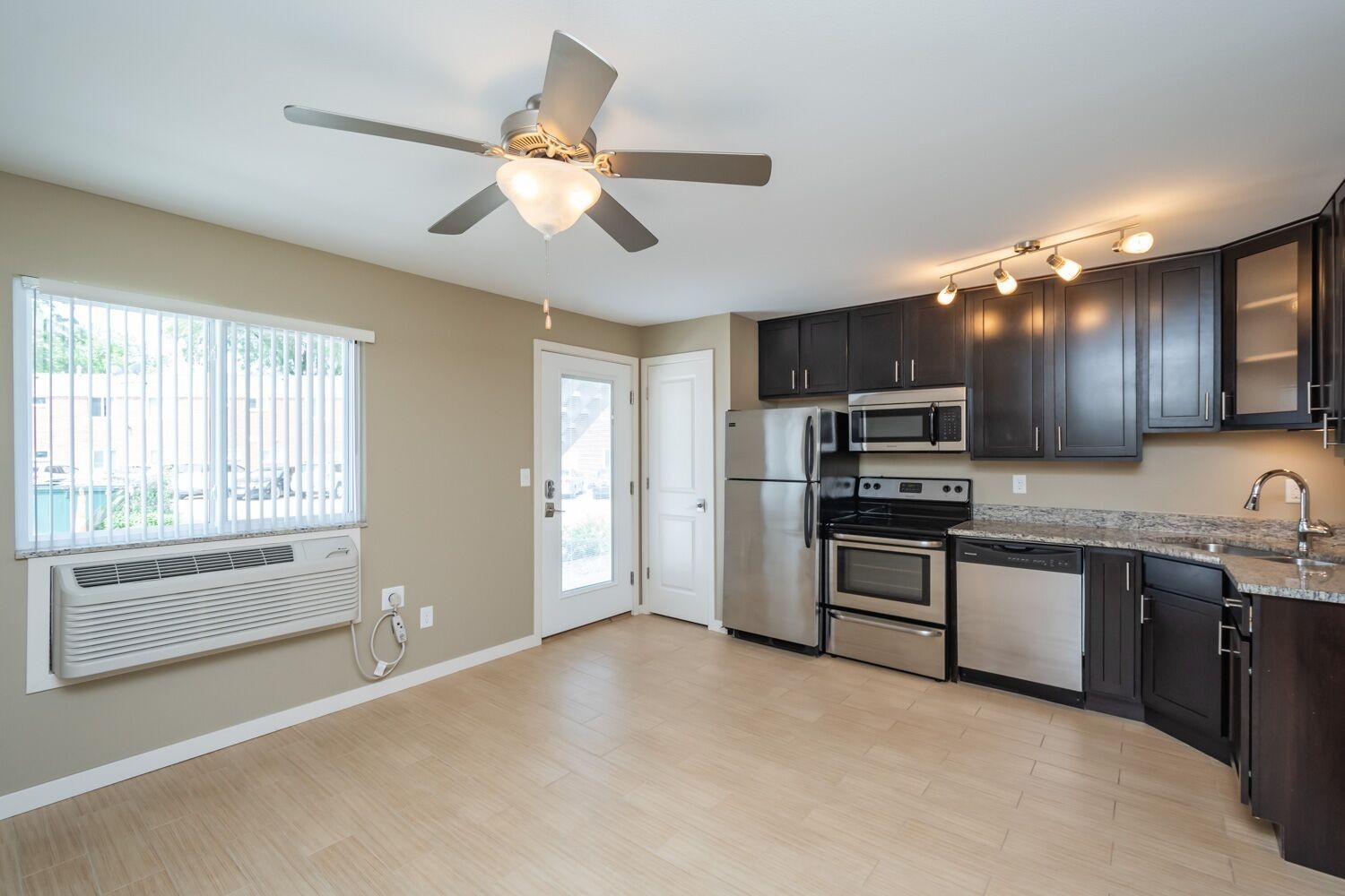 These cozy 400 SF 1-bedroom units are thoughtfully designed and feature beautiful granite countertops, espresso-colored cabinetry, stainless steel appliances, ceramic tile floors, in unit washer & dryer, and a patio. Residents enjoy free outdoor parking and options for 1 GIG fiber optics internet. This is a ground floor end unit.