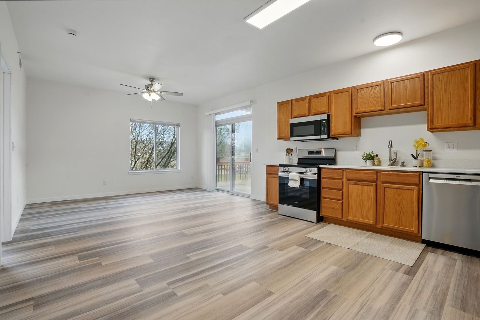 • Stylish, Fully Updated Kitchen: Enjoy cooking in a beautifully remodeled L-shaped kitchen featuring new quartz countertops, modern sink and faucet, and brand-new stainless-steel appliances—including a microwave, stove, refrigerator, and dishwasher—designed for both function and flair.
