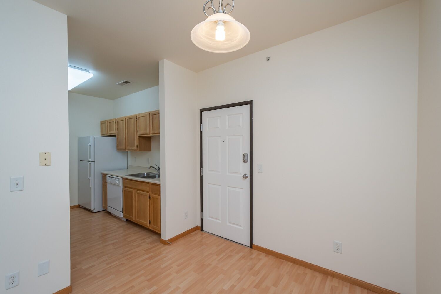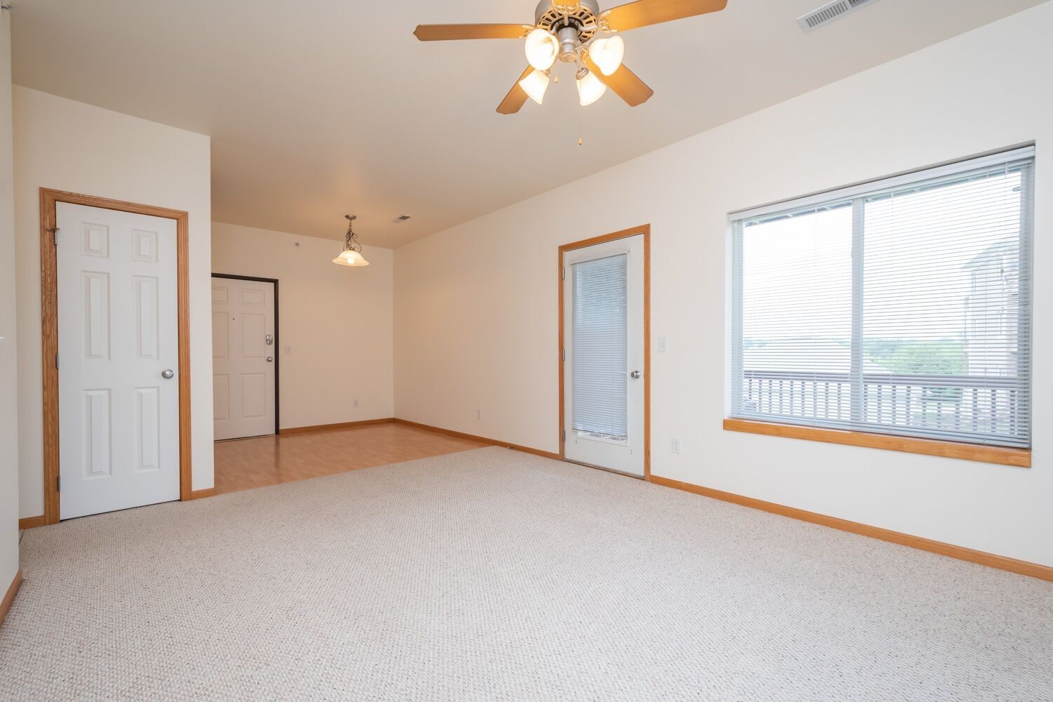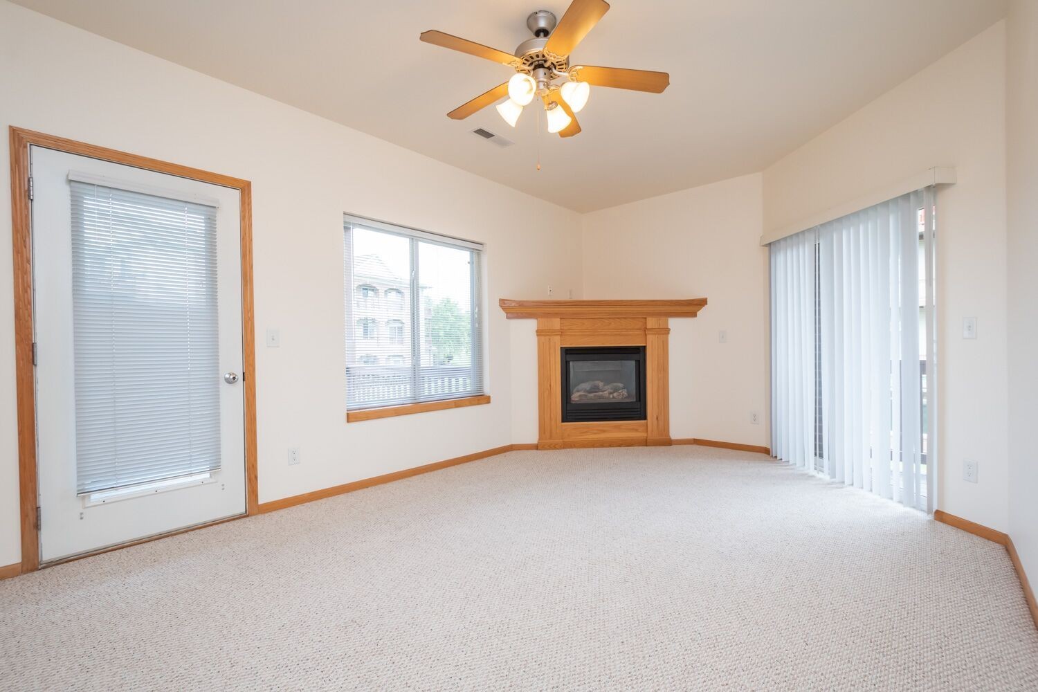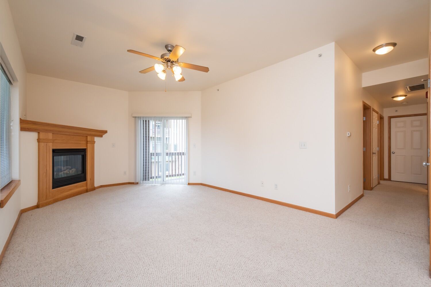 This spacious 2 bedroom, 2 bathroom condo features a gas fireplace in the living room, 2 balconies, central air conditioning, laminate hardwood floors in the kitchen and dining area, dishwasher, all appliances (including in unit washer and dryer new in 2025), ceiling fans, and also includes a one garage stall under the building. Our Residents enjoy free access to our on-site fitness center! This is a second-floor unit.