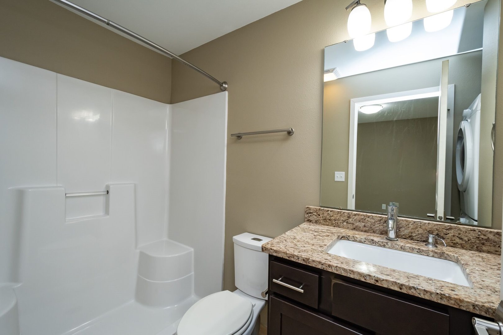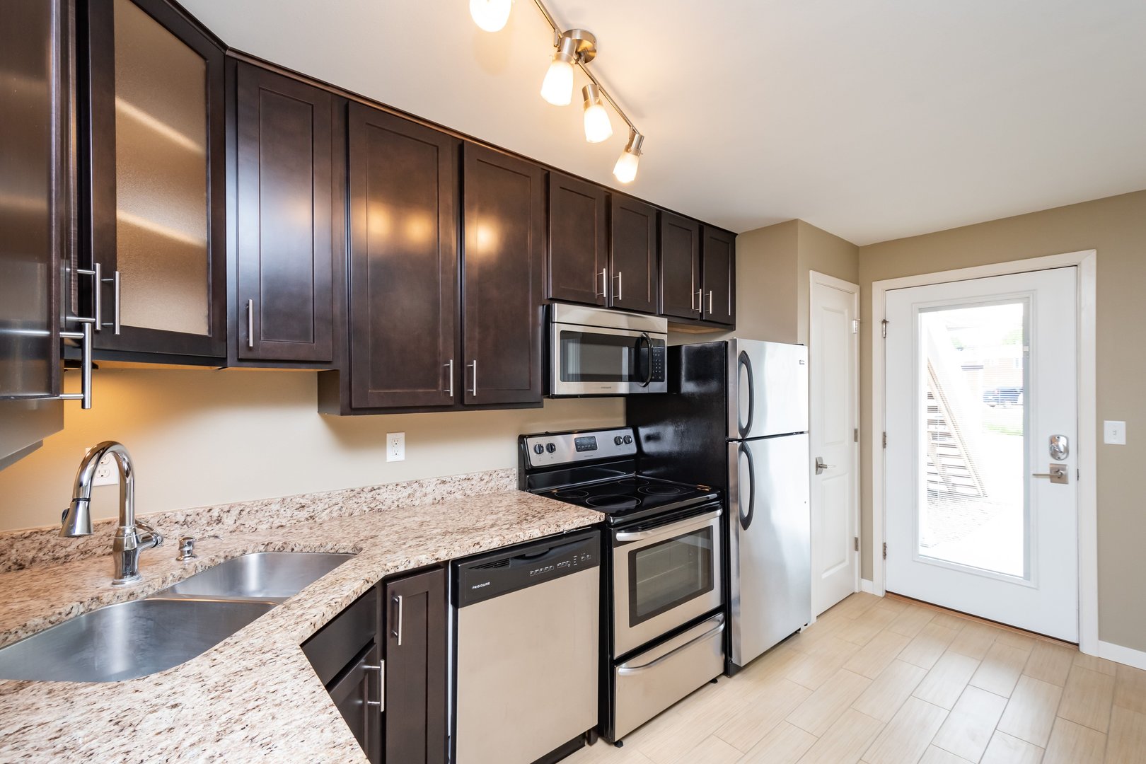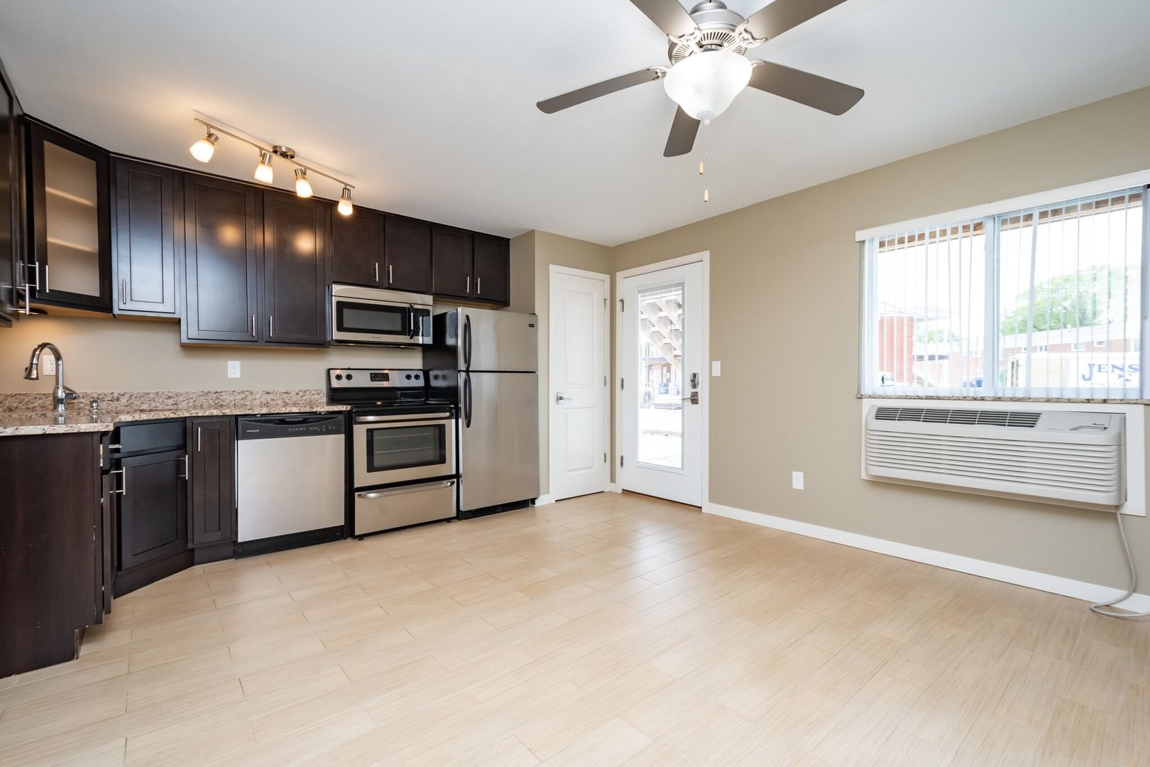 These cozy 400 SF 1-bedroom units are thoughtfully designed and feature beautiful granite countertops, espresso-colored cabinetry, stainless steel appliances, ceramic tile floors, in unit washer & dryer, and a porch. Residents enjoy free outdoor parking and options for 1 GIG fiber optics internet.