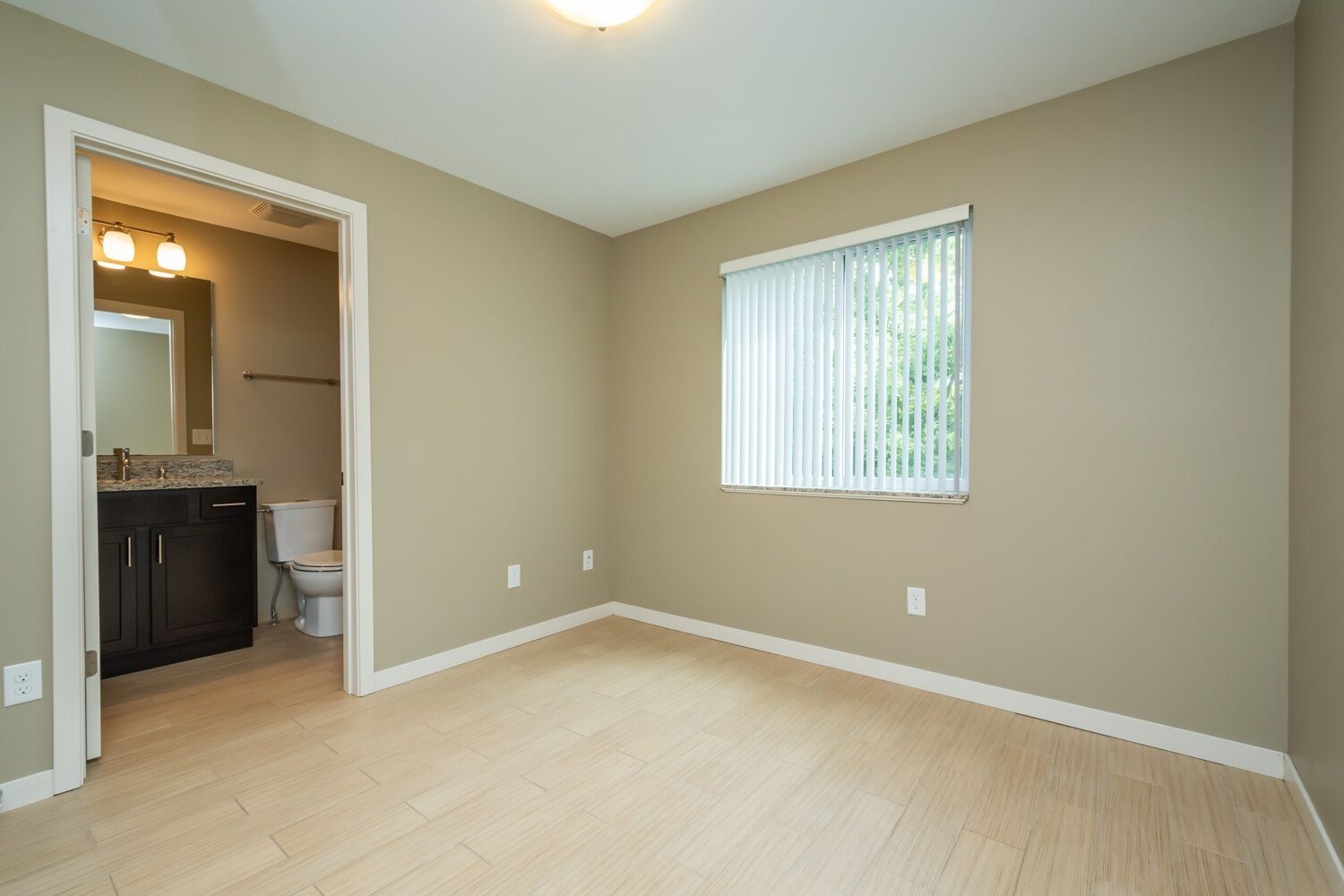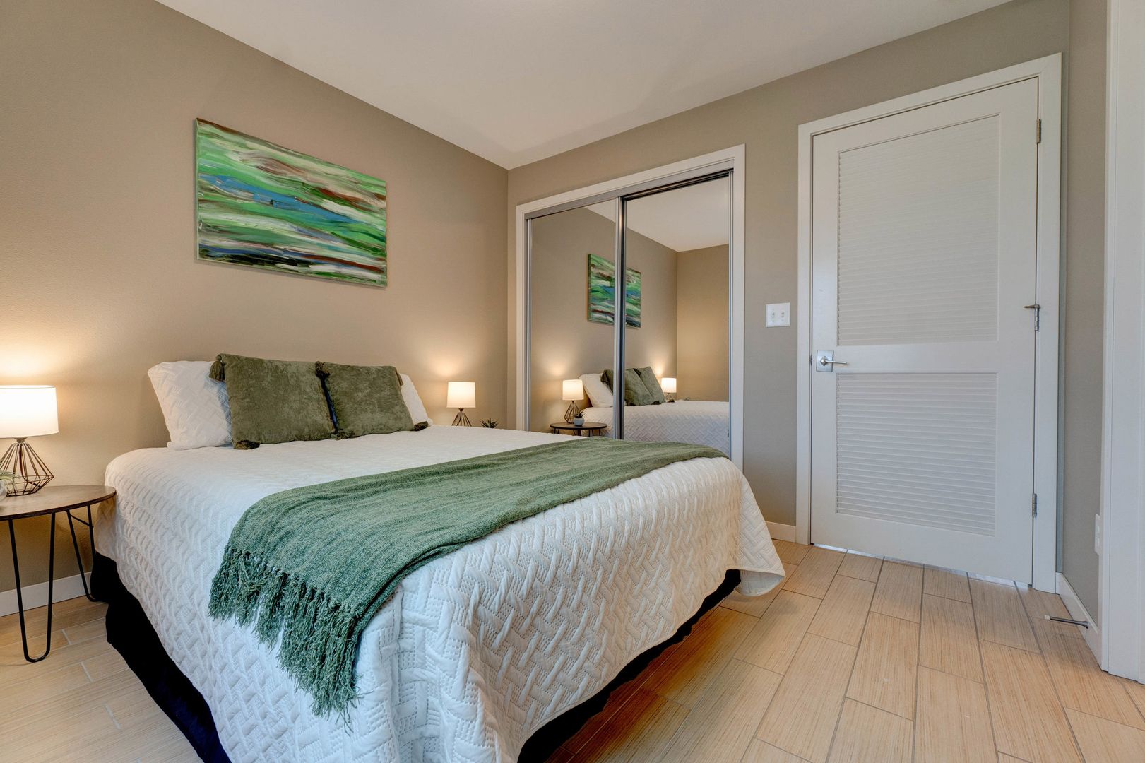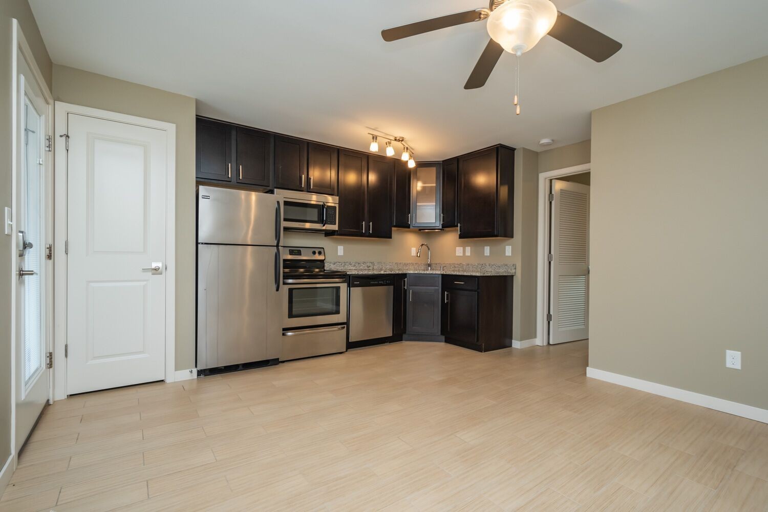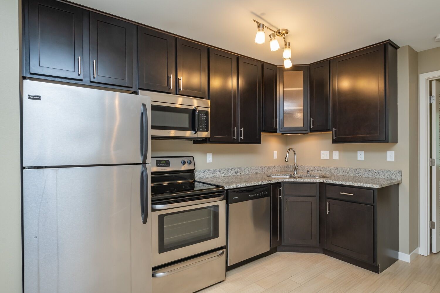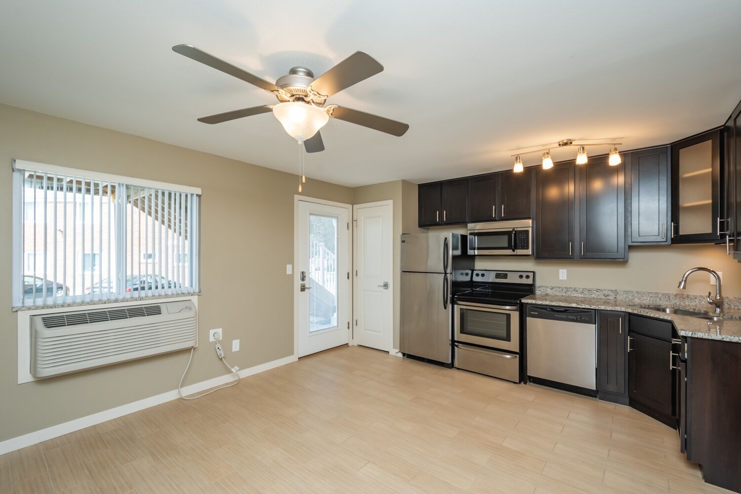 These cozy 400 SF 1-bedroom units are thoughtfully designed and feature beautiful granite countertops, espresso-colored cabinetry, stainless steel appliances, ceramic tile floors, in unit washer & dryer, and a patio. Residents enjoy free outdoor parking and options for 1 GIG fiber optics internet. This is a ground-floor unit.