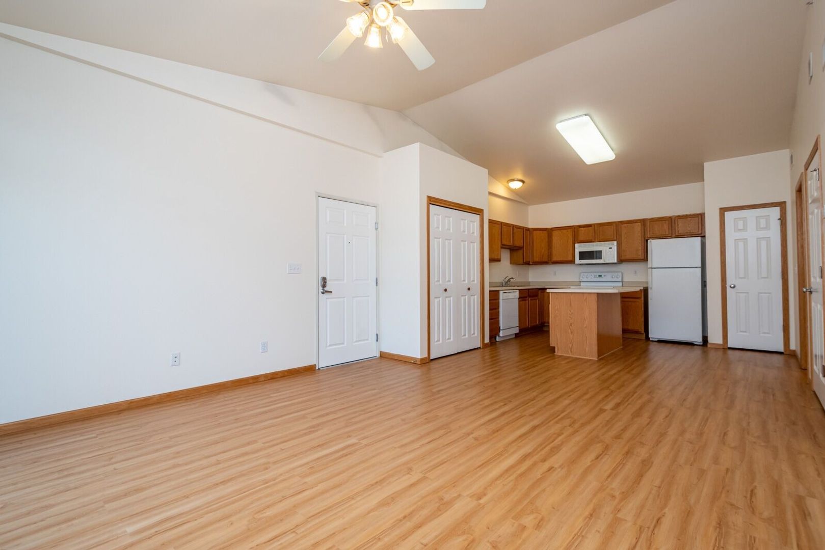 This unit features beautiful wood floors in the kitchen and living room, all appliances (including washer/dryer), center island breakfast bar, pantry, vaulted ceilings, ceiling fans, large walk-in closet, spacious bathroom, large/sunny balcony, one car garage stall and low utilities! This building is ENERGY-STAR RATED by MidAmerican Energy ($40 - $70/month average for gas & electric)!