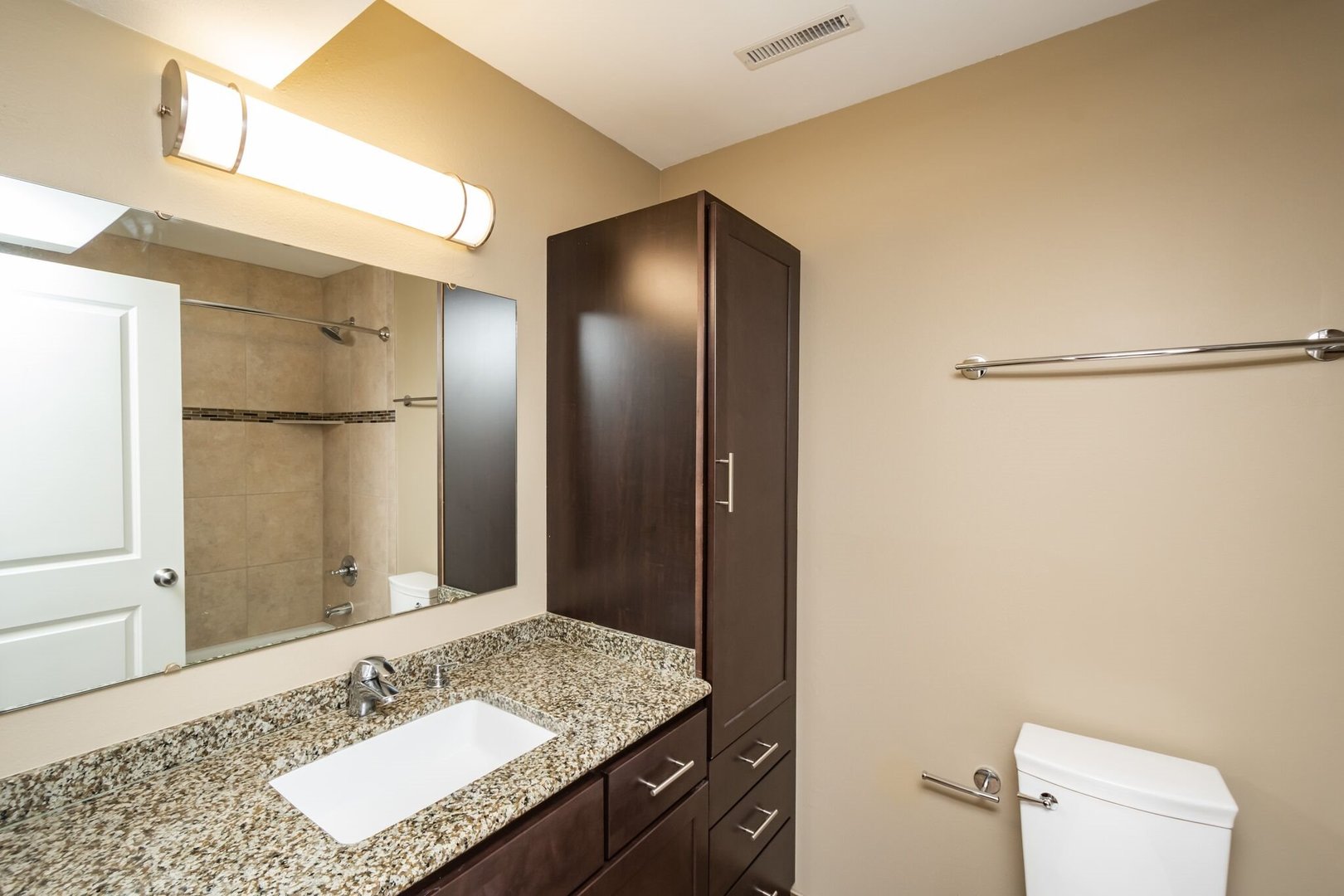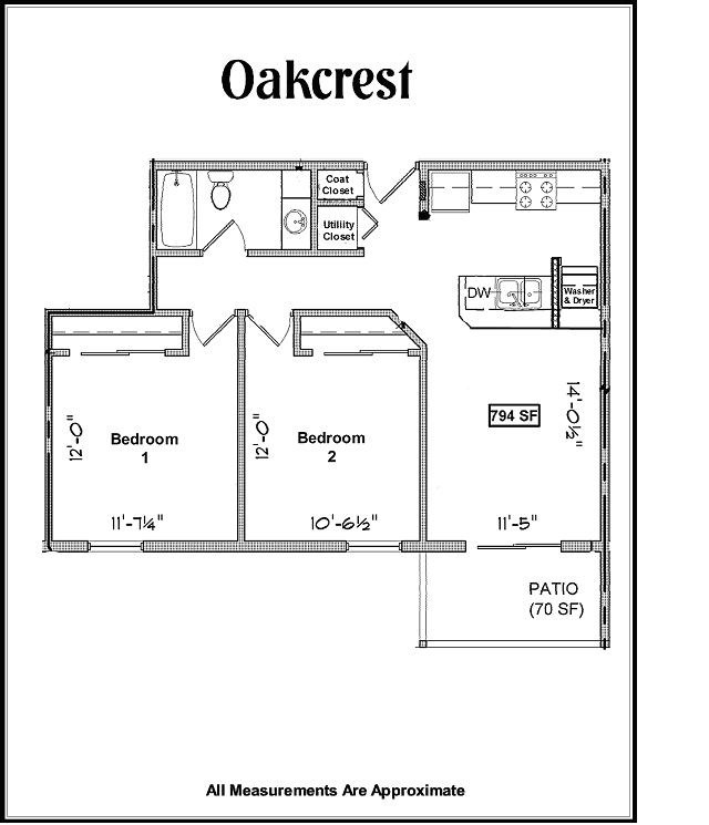 Our 2BR, 1 bath Oakcrest units have a modern feel and upscale finishes. These units feature gorgeous laminate hardwood floors in the main living area, stainless steel appliances, beautiful espresso colored cabinetry, granite counter tops, washer & dryer, balcony, ceramic tile floors in the bathrooms, ceiling fans and window treatments! Each unit includes one parking stall in the common garage with a bike rack in each stall. This is a second-floor unit. This unit got new carpet in the bedrooms in 2025.